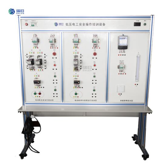 Trainees conduct motor wiring training with reference to the motor forward and reverse control circuit schematic diagram. The motor used in the equipment is replaced by an indicator light. When the forward and reverse circuits of the motor are connected, press the forward button, and the corresponding phenomenon is that the green indicator light of the forward button is on. Similarly, press the reverse button, and the corresponding phenomenon is that the red indicator light of the reverse button is on, which indicates that the trainees' wiring is correct.